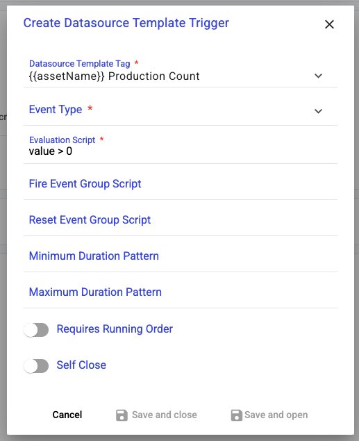 * **Self Close** - When true and the evaluation becomes false, the event inside tillit will be marked as COMPLETED with the closedAt time. When false, the event remains ACTIVE regardless of the evaluation script.