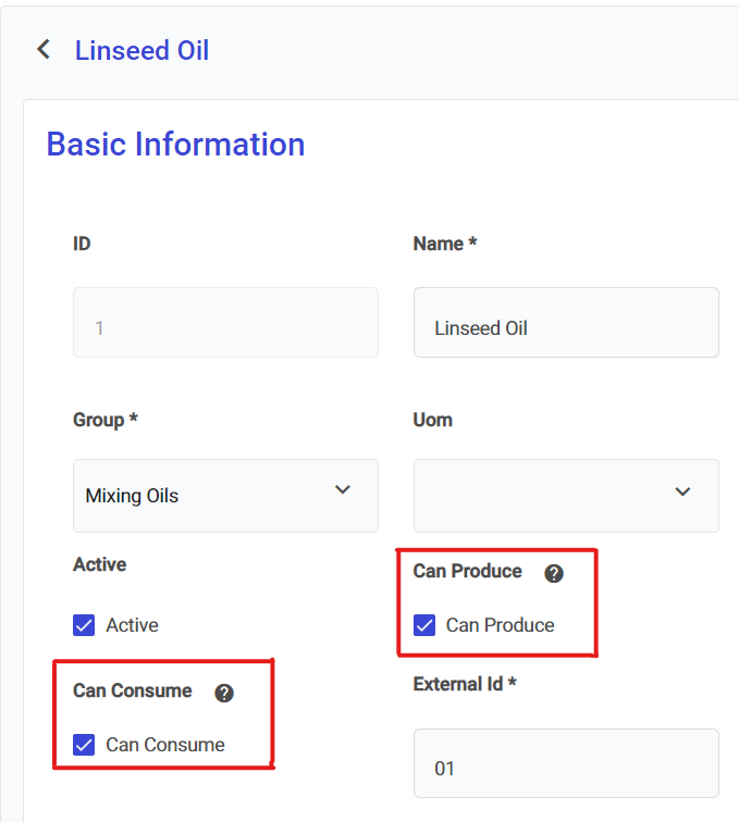 Select the **relevant Material**, make sure the **Can Produce** and **Can** **Consume** boxes are checked.