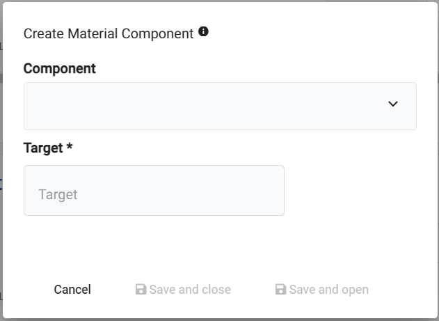 You will be presented with a pop up. You will need to select the External ID, of the Material you wish to use as a Component, from the drop-down list. Next you'll need to set the Target quantity of the component used to create your produced material.
