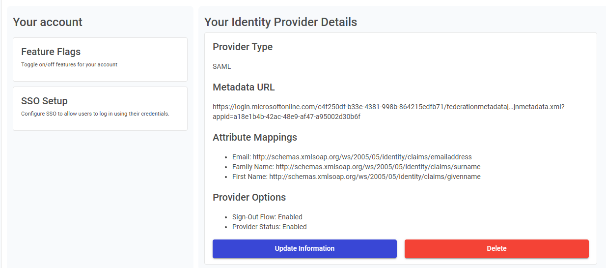 Click on your avatar on the top right, choose **Account**, of which then you will presented with the below UI. Click on **SSO** setup and start the SSO Setup.