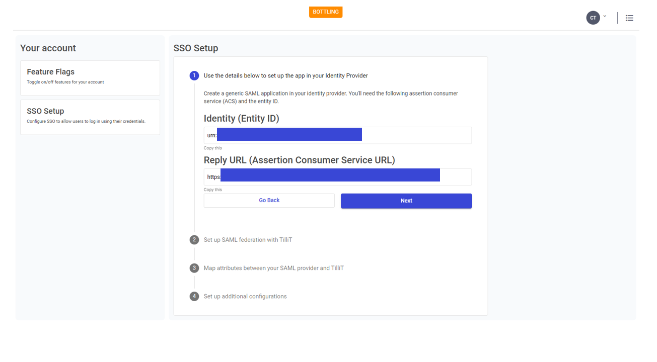 In the Identifier (Entity ID) and Reply URL, enter the data you've received from the Account page.