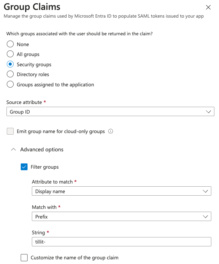 Here we have added the groups claim in to our Enterprise Application in Azure. We have modelled our Azure Groups using the “tillit-” prefix and only send those in the SAML claims.