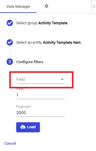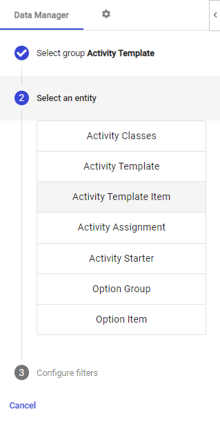 When you select once of the above Groups, you'll be asked to select an entity. To understand the various entities, you will need to understand the data you're accessing. This is best done by reading through the various articles in Setting up TilliT.For this following example, we'll use one of the most commonly used groups, Activity Template, and click on the Activity Template Item entity.